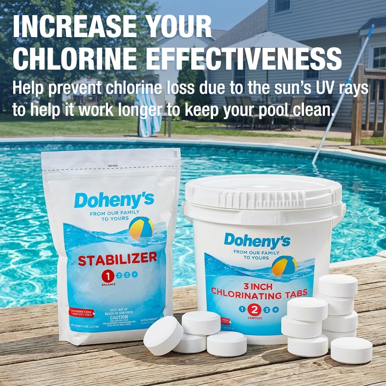 - Swimming Pool Chlorine Stabilizer: Increases your chlorine's effectiveness by protecting it from dissipation caused by the sun's UV rays